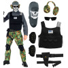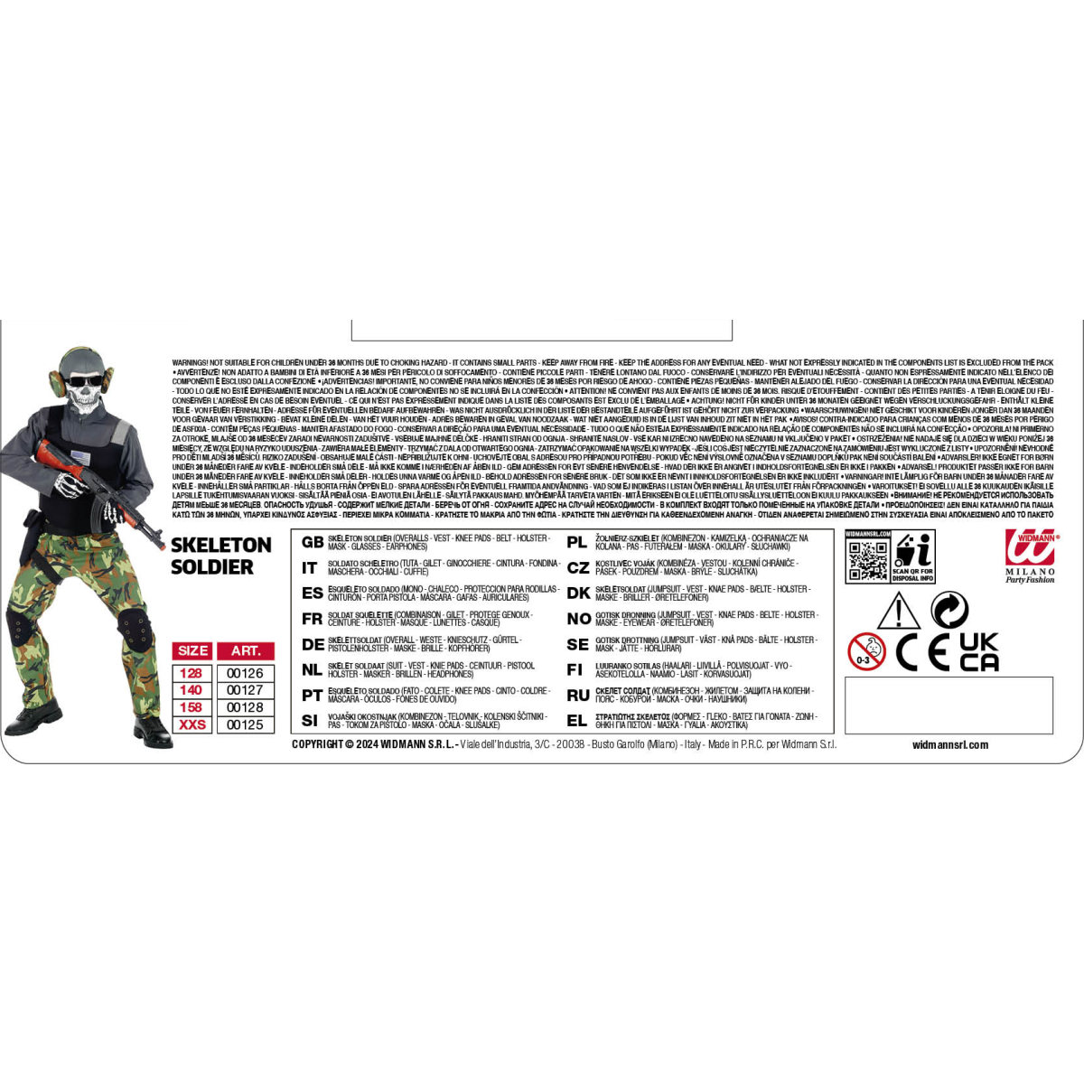 Karnevalski kostim za vojnika kostura uključuje: kombinezon, prsluk, štitnike za koljena, remen, torbu, masku i naočale.