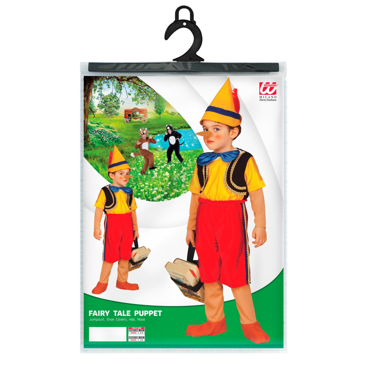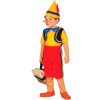 Razigrani kostim Pinokio za djecu savršen je za transformaciju u legendarni drveni lik iz bajki. Kostim se sastoji od svijetlih boja: sunčano žuta košulja s crnim rubom i crvene hlače. Dodan je i klasični žuti šešir ukrašen crvenim perom koji upotpunjuje izgled iz bajke. Nos koji se lako postavlja bitan je dodatak ovom liku.