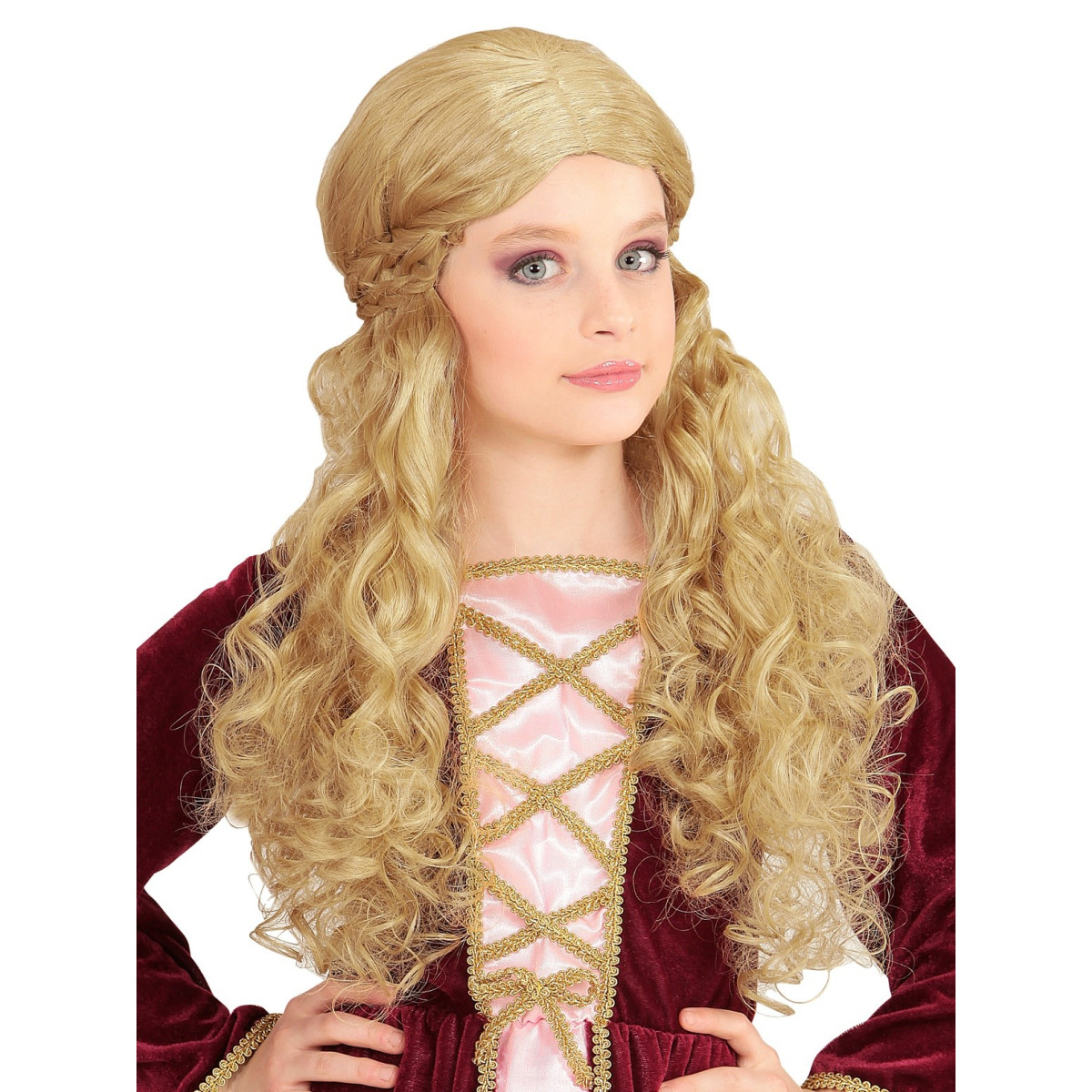 Blond devojačka perika inspirirana je elegantnim frizurama srednjeg vijeka. Kosa ove perike je valovita. Duljina ispod grudi omogućuje kosi da elegantno pada niz leđa. Blond boja perike sa sobom donosi osjećaj nježnosti, svježine i prirodnog sjaja. Veličina perike je univerzalna i pogodna je za djevojčice.