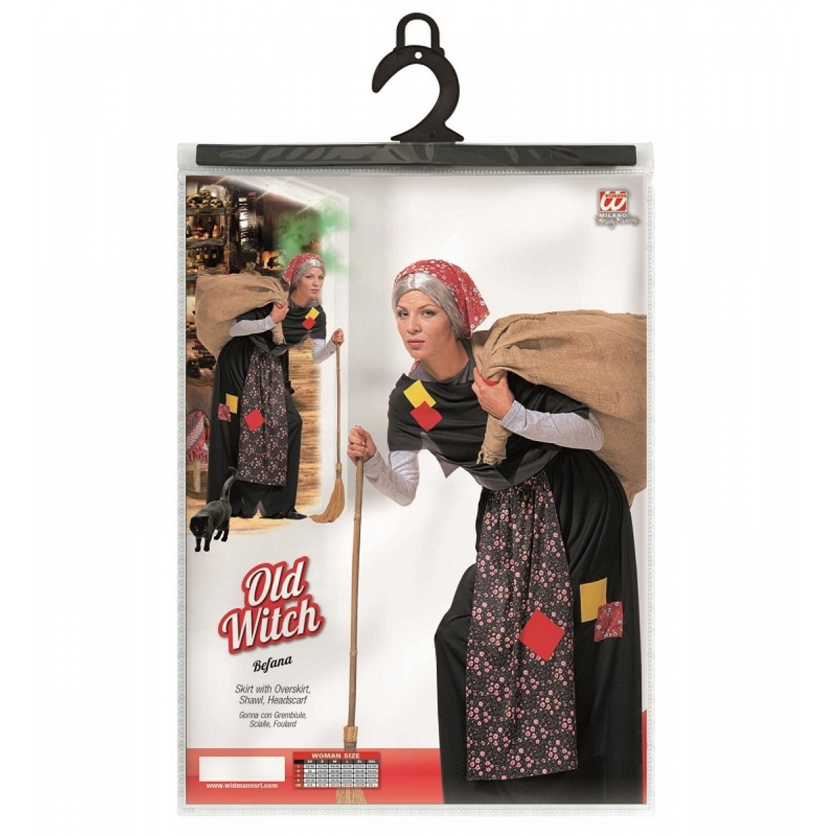 Karnevalski kostim stare vještice uključuje suknju s pregačom, šal i maramu. Karnevalski kostim pogodan je i za muškarce i za žene. Dostupan je u veličinama S, M in L.