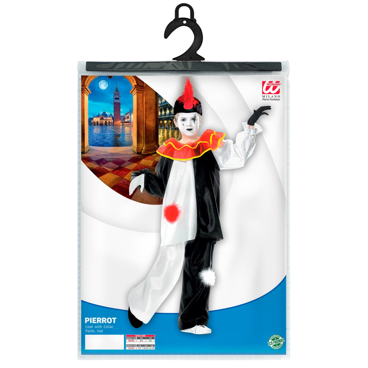 Dječji karnevalski kostim Pierrot u crno-bijeloj kombinaciji s crvenim pomponom i šarenim ovratnikom donosi čar klasičnog kazališta na karnevalske zabave. Kostim sadrži ogrtač s ovratnikom, hlače i prepoznatljivu kapu koji zajedno stvaraju jedinstven i bajkovit izgled.
