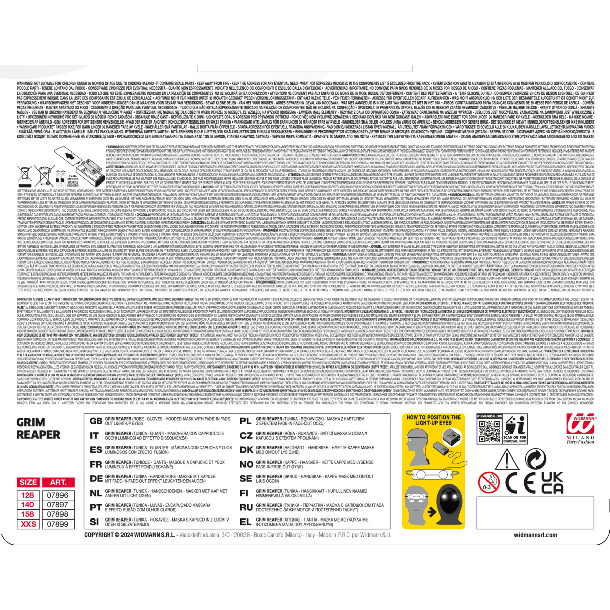 Onda je to definitivno karnevalski kostim za kostura Grim Reaper. Karnevalski kostim uključuje dugu crnu haljinu s maskom i rukavicama. Prsa i rukavice su obložene lateksom. Maska, međutim, ima blistave oči. Oči svijetle i gase se. Zasvijetle i ugase se...