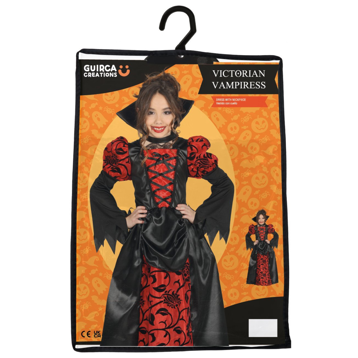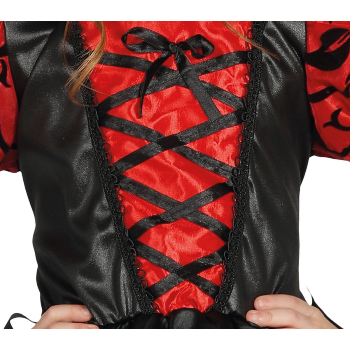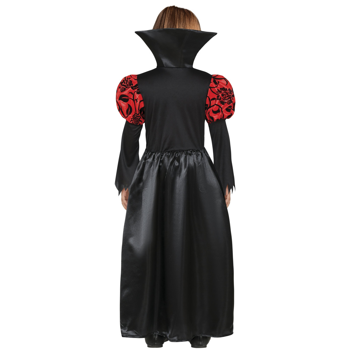 Dječji kostim vampirice savršen je izbor za male ljubiteljice mističnog i elegantnog izgleda. Crno-crvena kombinacija sa satenskim sjajem i visokim ovratnikom stvara dojam prave plemićke iz svijeta tame. Idealno za Noć vještica, maškare ili tematske zabave.