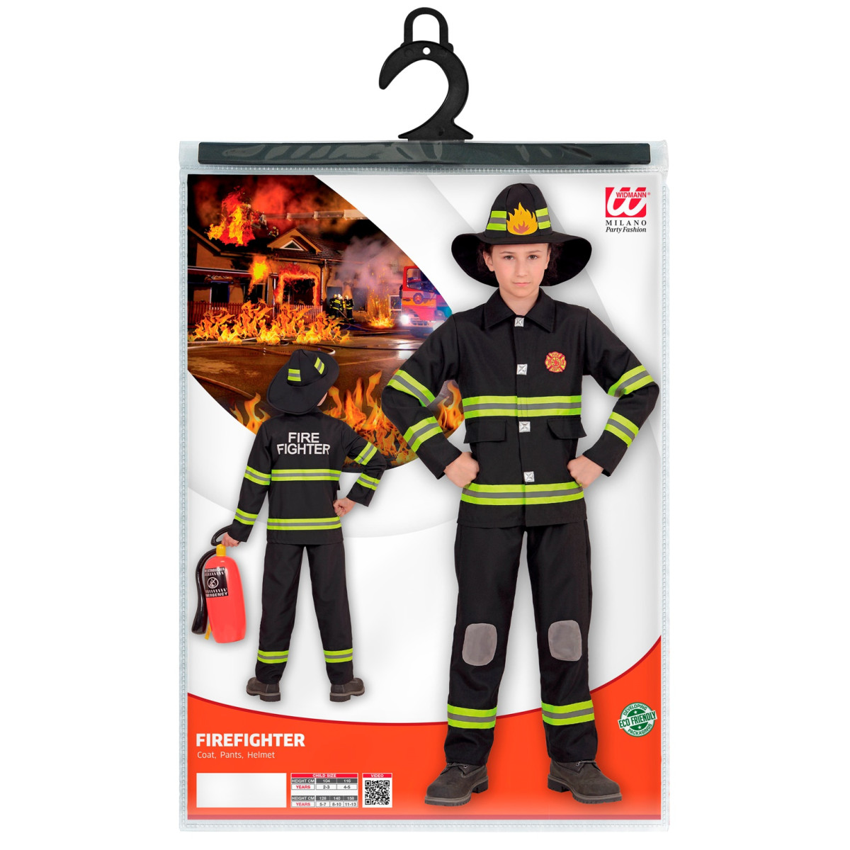 Vatrogasni karnevalski kostim za djecu uključuje jaknu, hlače i kacigu, a sve je izrađeno od crne tkanine sa živopisnim žutim reflektorima za autentičan izgled. Kostim je dizajniran, da bude udoban za nošenje, ali u isto vrijeme omogućuje djeci da se užive u ulogu hrabrog vatrogasca. Svojim realističnim izgledom i dodacima, ovaj će kostim zasigurno impresionirati male heroje na karnevalu. Važno je napomenuti da aparat za gašenje požara nije uključen u set.
