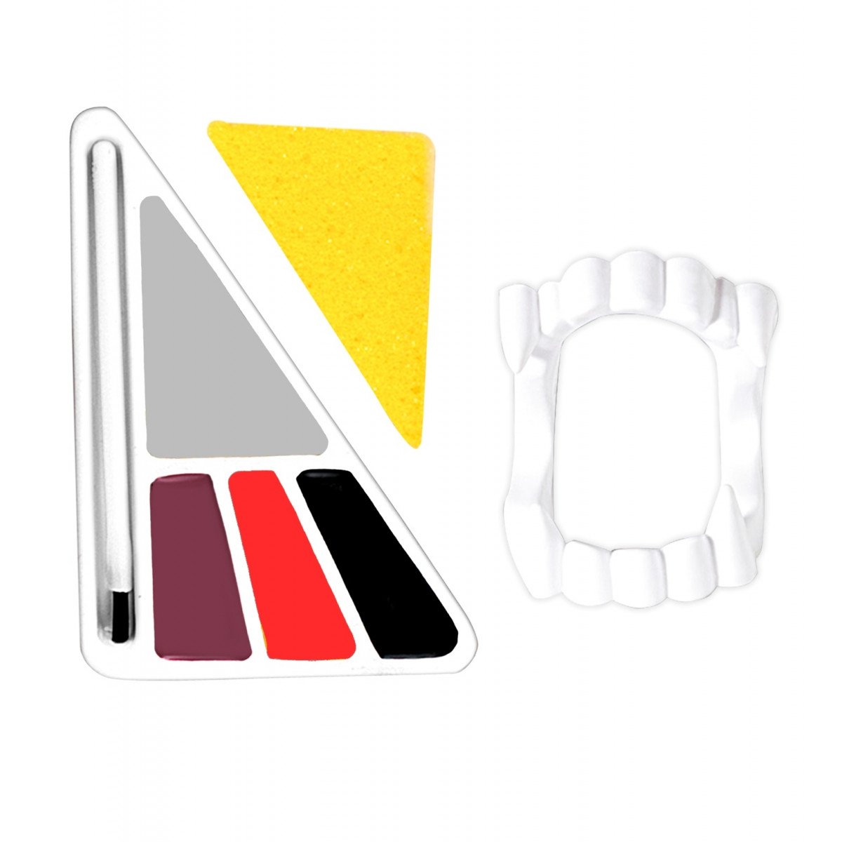 Make up set za Vampira sadrži boje za šminkanje Vampira i dodatak - zube za Vampira. Set uključuje četiri boje i spužvu te kist za nanošenje boje.