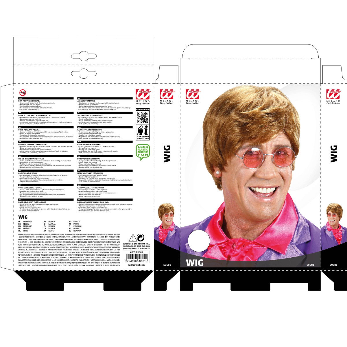 Ova muška perika ima kratku, svjetlosmeđu kosu koja stvara živahan i sjajan izgled. Kosa je oblikovana u elegantnom stilu koji oponaša Eltonove prepoznatljive frizure. Gornji dio perike je nešto duži, što omogućuje blage valove i teksturu, dok je kosa sa strane i potiljka kraća. Ova perika idealna je za dočaravanje Eltonovog jedinstvenog i prepoznatljivog izgleda na pozornici ili na tematskim događanjima