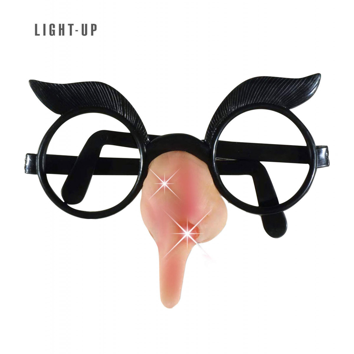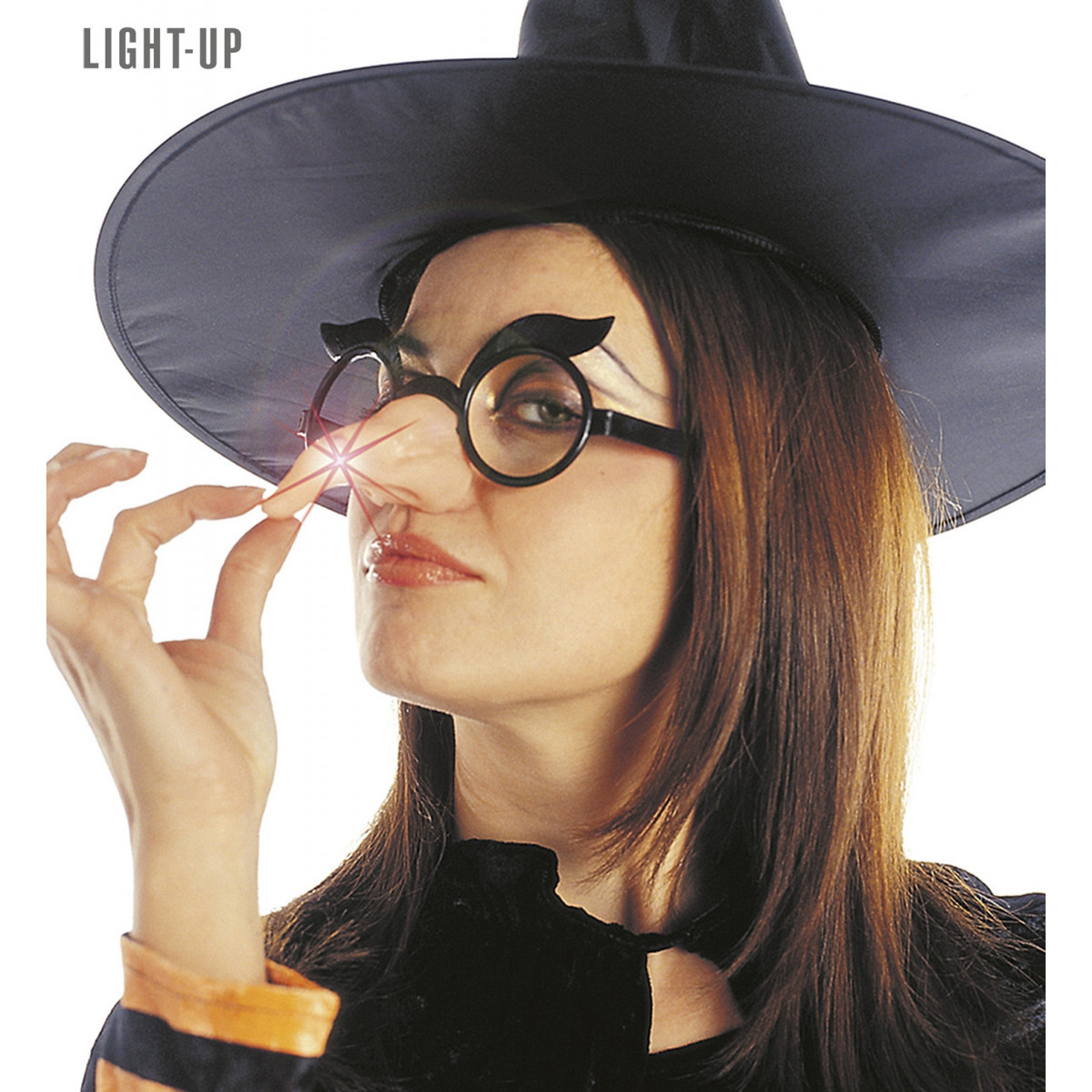 Vještičje naočale imaju dodatni čarobni nos koji bljeska pri pritisku. Okvir je crn s plastičnim obrvama. Izvrstan izbor za kostim vještice. Naočale s bljeskajućim nosom.