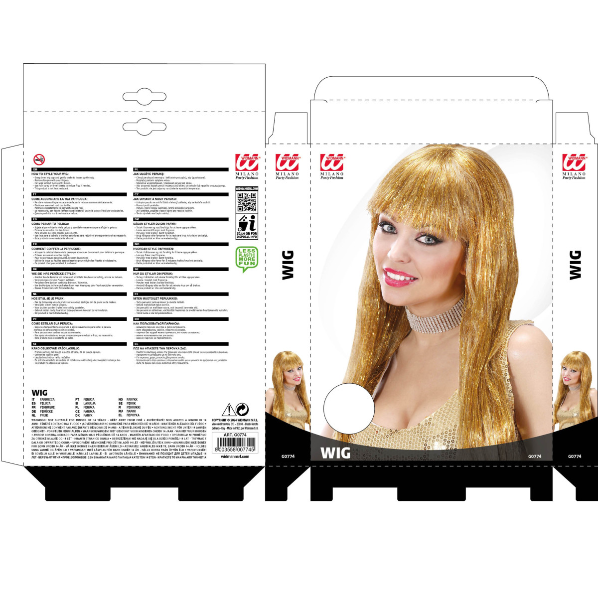 Glitzy zlatna karnevalska perika također je idealna za svakoga tko želi karnevalskom izgledu dodati točku na i. Kosa je duga, s umetnutim zlatnim svjetlucavim pramenovima između. Zlatna perika je udobna i dobro se prilagođava različitim oblicima glave. Zlatna karnevalska perika za Zlatokosu.