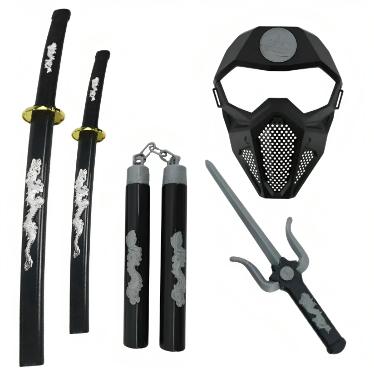Komplet oružja ninja ratnika sastoji se od 7 dijelova. Set sadrži: 2x mač, 2x štitnik za mač, 1x nunčake, 1x sai i 1x maska.