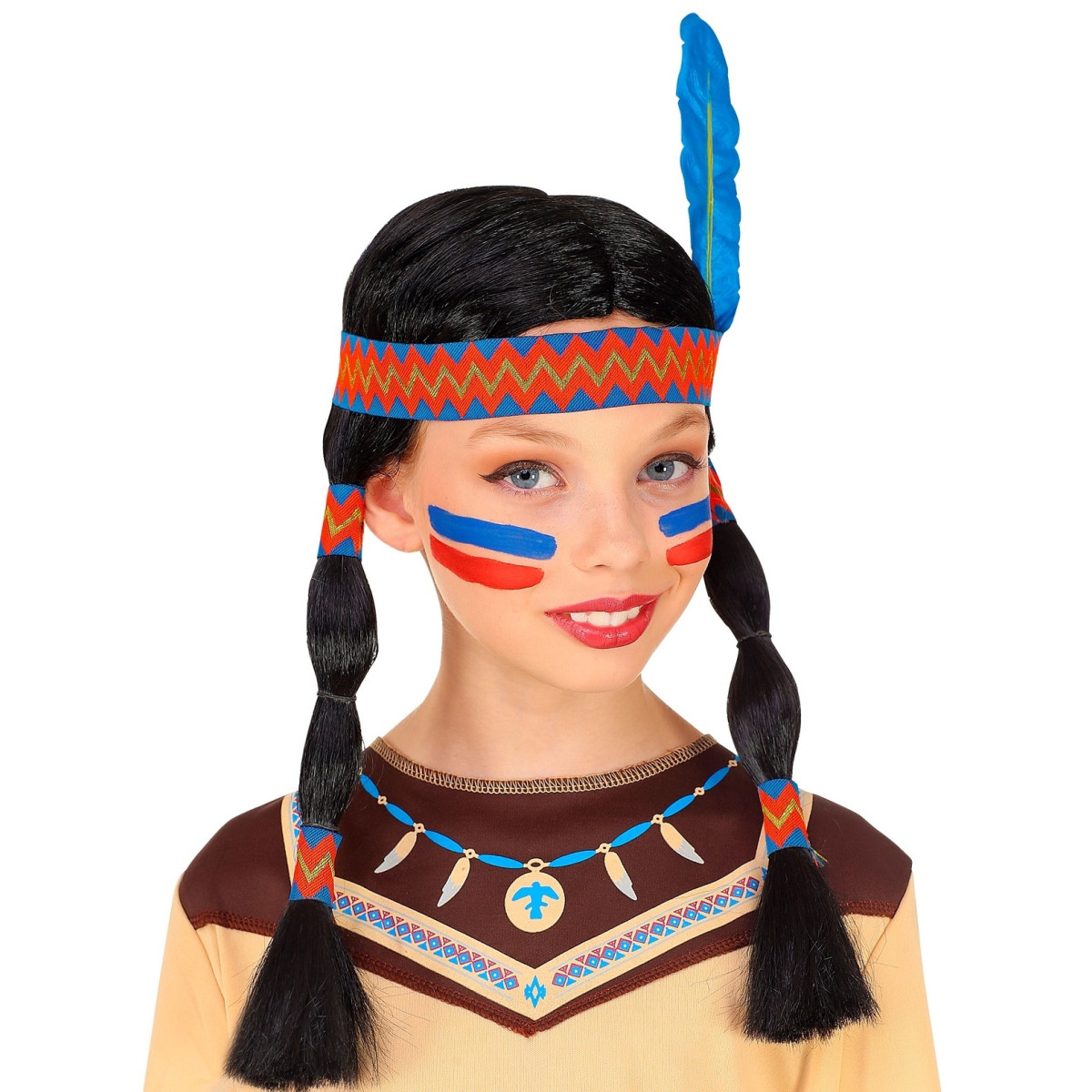 Dječja karnevalska perika za indijansku djevojčicu. Perika ima crnu kosu svezanu u dva repa. Također uključuje traku spjenom u plavoj boji. Veličina perike je univerzalna za djecu.