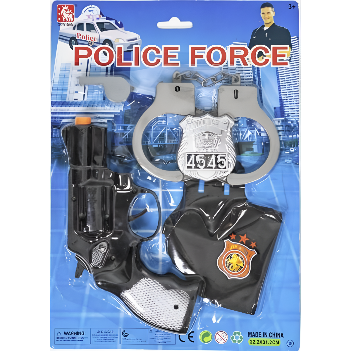 Set za policajca uključuje: pištolj, lisice, značku, futrolu za pištolj i zviždaljku.