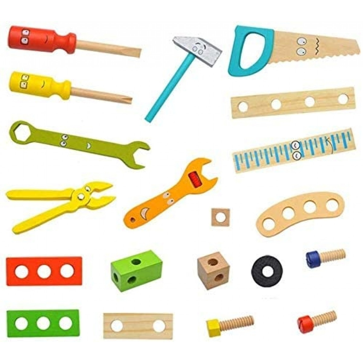 Set alata uključuje čak 34 izuzetno atraktivna alata i dijelove za sastavljanje prijevoznih sredstava - aviona, automobila, traktora, kolica ... U igru ne pozivaju samo simpatični alati, već i mnoštvo šarenih boja, kojima ne može odoljeti ni najzahtjevniji mali junak. Dječji alati i materijali za montažu pohranjeni su u lijepo dizajniranom drvenom kovčegu. Istodobno, dijete možete naviknuti na stvaranje reda tijekom rada.