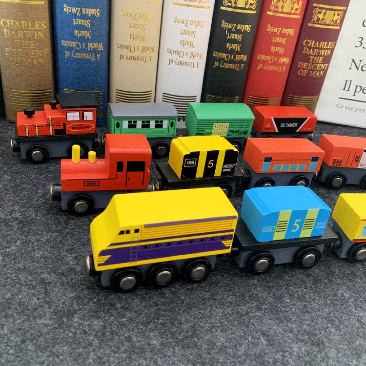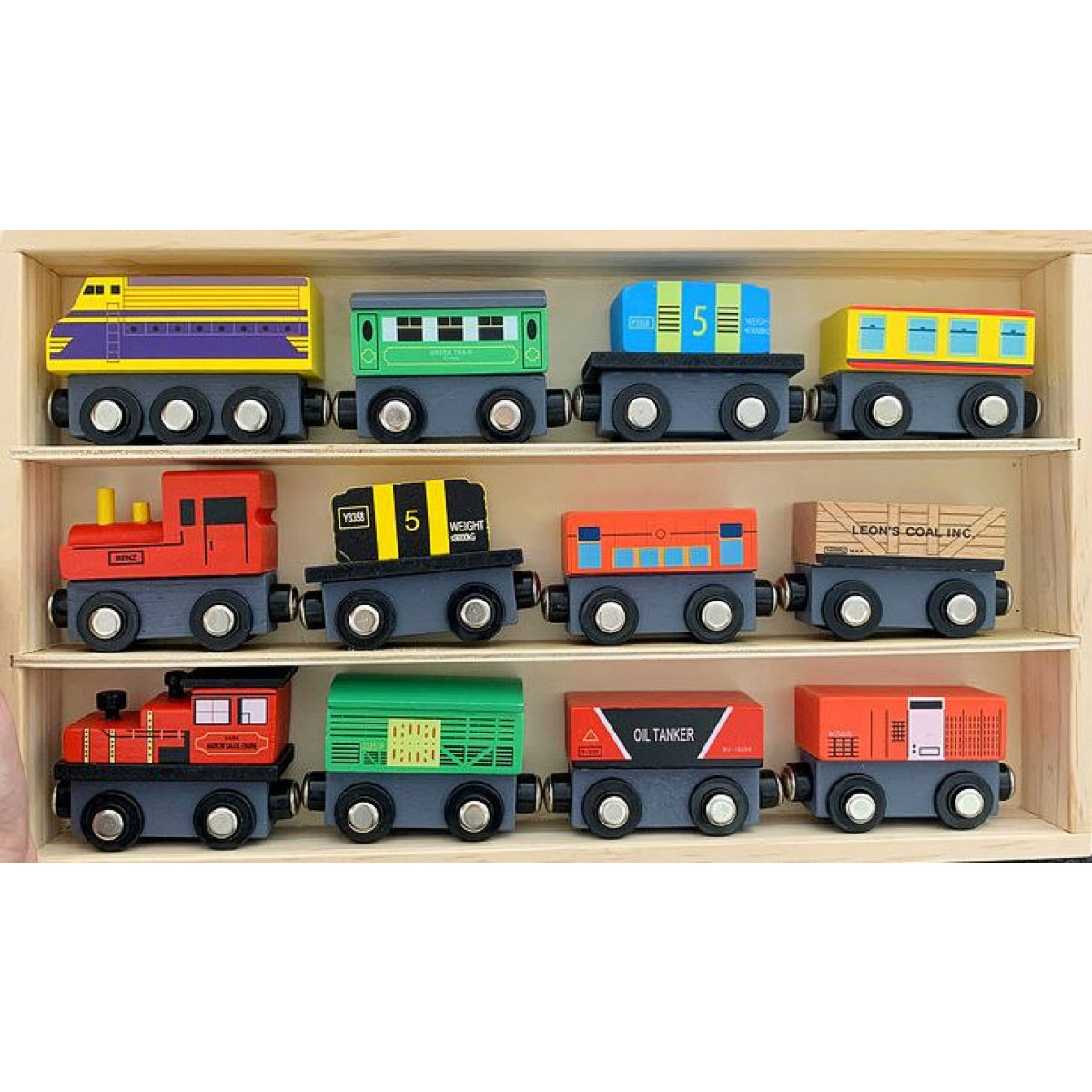 Set drvenih vlakova uključuje tri lokomotive i devet vagona. Svi su opremljeni magnetima koji omogućavaju jednostavno spajanje i sastavljanje različitih kompozicija vlakova. Također je u setu je priložena drvena kutija za pohranu koja omogućava sigurno čuvanje svih dijelova igre, što je praktično i organizirano.