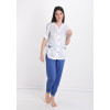 Komplet ženska pidžama s cvjetnim motivom. Pidžama je izrađena od mekanih pamučnih tkanina. Materijal je prikladan za kožu. Šavovi su precizni i kvalitetni. Rukavi pidžame su kratki. U njoj ćete dobiti maksimalnu udobnost, što će pozitivno utjecati na kvalitetu vašeg sna tijekom svih godišnjih doba. Uživajte u laganim i ugodnim noćima!